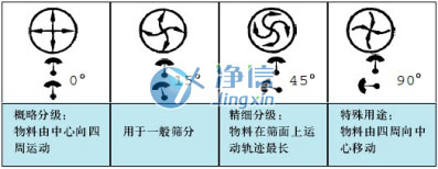 三次元旋振篩,由直立式電機作激振源,電機上端安裝偏心重錘(基準塊),下端安裝可調節偏心塊,如下圖所示,當兩側偏心塊向中間合攏,振幅變小;當偏心塊向兩側分離,振幅變大。通過調節偏心塊的位置將電機的旋轉運動轉變為水平、垂直、傾斜的三次元運動,通過調整下端兩偏心塊的夾角大小來控制振幅,把這個運動傳遞給篩面調節下端偏心塊的相位角,可以改變物料在篩面上的運動軌跡。